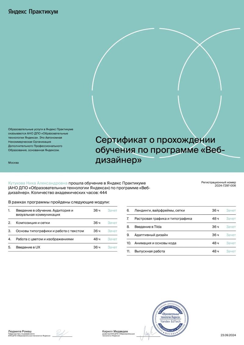 - Сертификат о прохождении обучения по программе «Веб дизайнер», 2023–2024 гг.