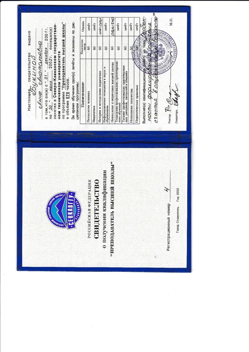 - Северо-Кавказский государственный технический университет г. Ставрополь, квалификация «преподаватель высшей школы», 2001–2002 гг.