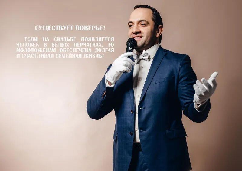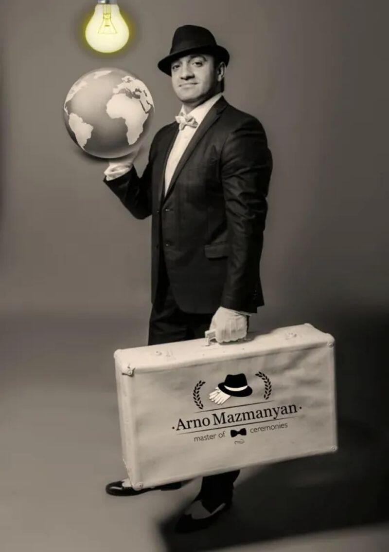 - Арно Мазманян – ведущий в белых перчатках. Ведь существует поверье, что если на празднике появился человек в белых перчатках, у молодых будет счастливая жизнь. Ведущего отличает провозглашение авторских тостов, может снять клип с гостями под песню с именами молодых, носит с собой белый чемоданчик, полный приятных сюрпризов.
