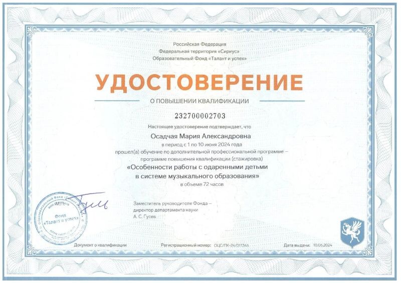 - Образовательный фонд «Талант и успех», программа «Особенности работы с одарёнными детьми в системе музыкального образования», 2024 г.