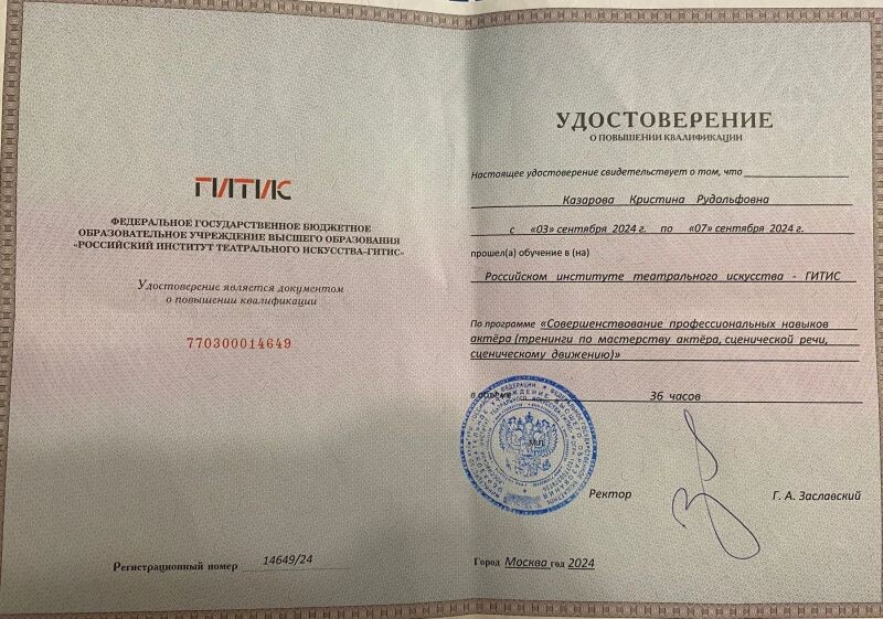 - ГИТИС (повышение квалификации) по программе «Совершенствование профессиональных навыков актера (тренинги по мастерству актера, сценической речи, сценическому движению)», 2024 г.
