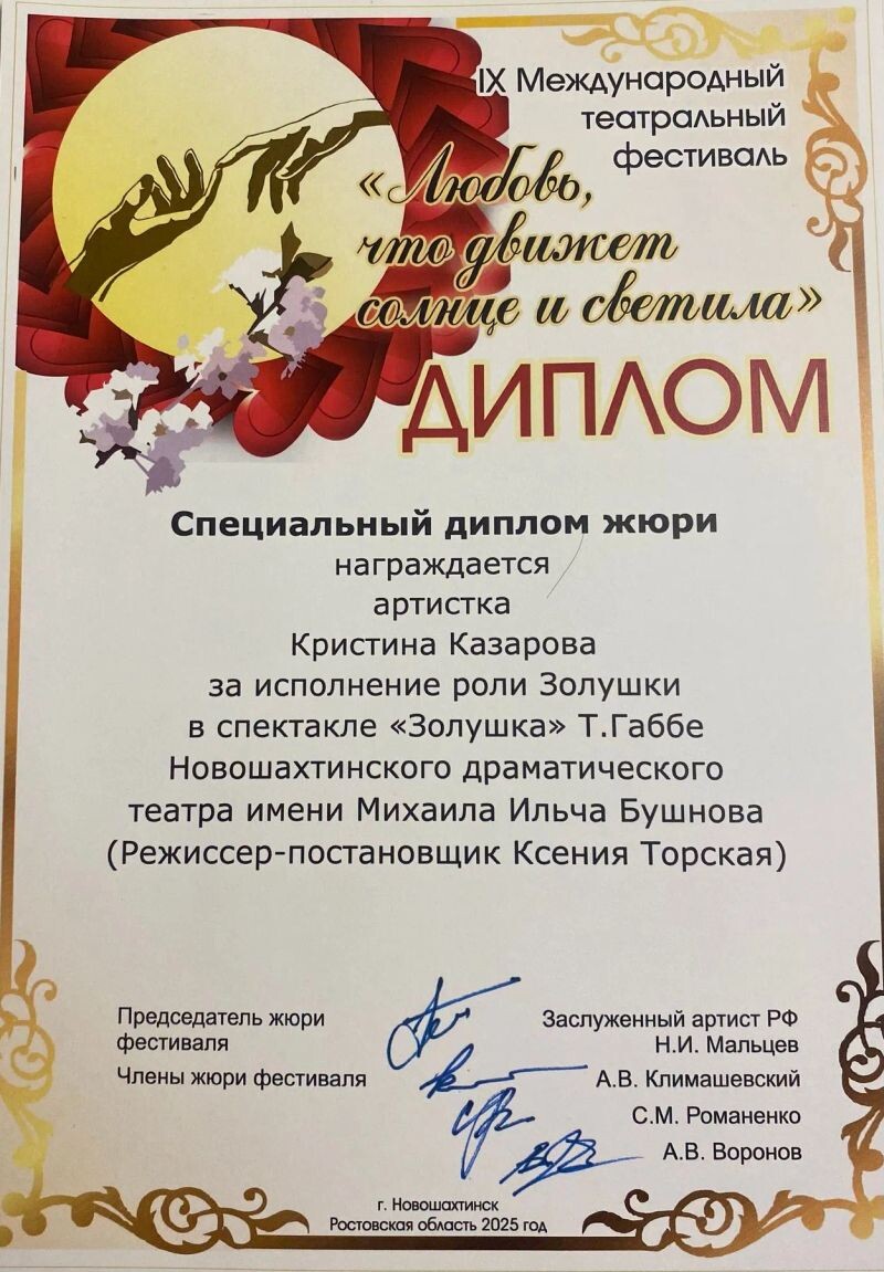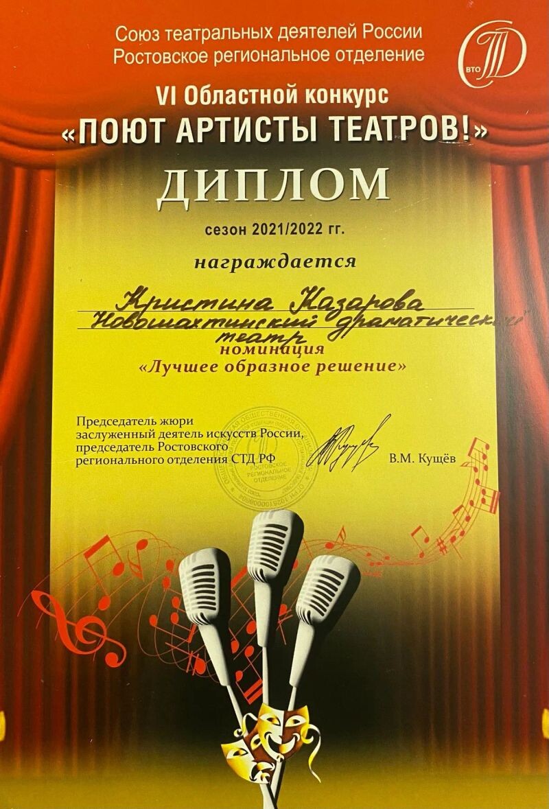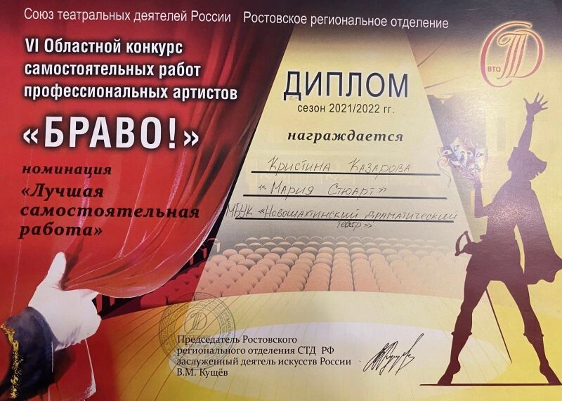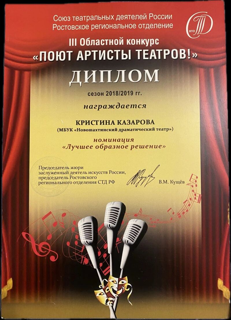 - Ростовское региональное отделение Союза театральных деятелей РФ «МЕЛЬПОМЕНА», номинация «Творческий прорыв» за исполнение роли Мефистофеля в спектакле «Фауст», 2020 г.