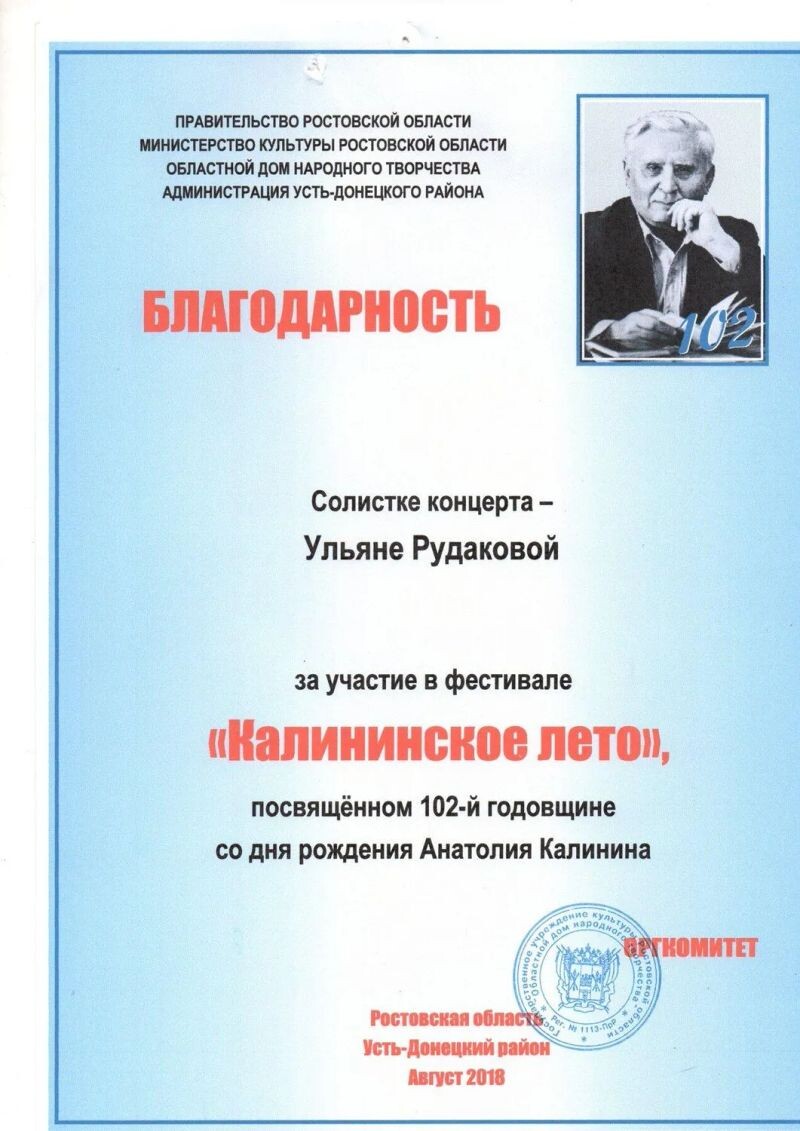 - Благодарность за участие в фестивале «Калининское Лето», 2018 г.