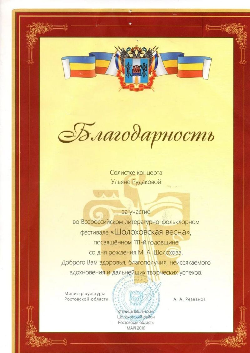 - Благодарность за участие во всероссийском литературно-фольклорном фестивале «Шолоховская Весна», 2016 г.