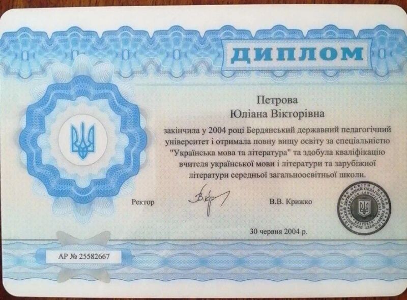 - Бердянский государственный педагогический университет, учитель украинского языка и литературы и литературы и зарубежной литературы средней общеобразовательной школы, 2000–2004 гг.