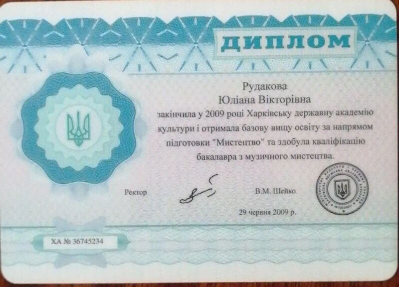 - Харьковская государственная академия культуры, бакалавр музыкального искусства, 2005–2009 гг.