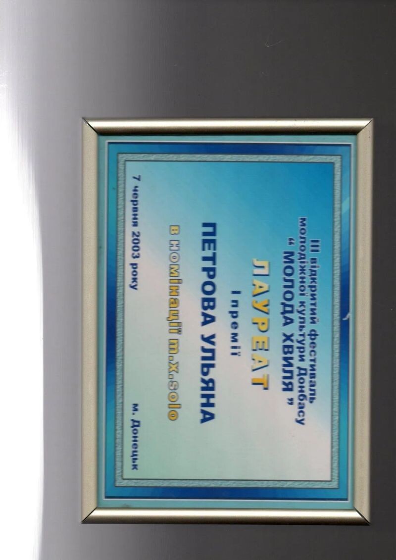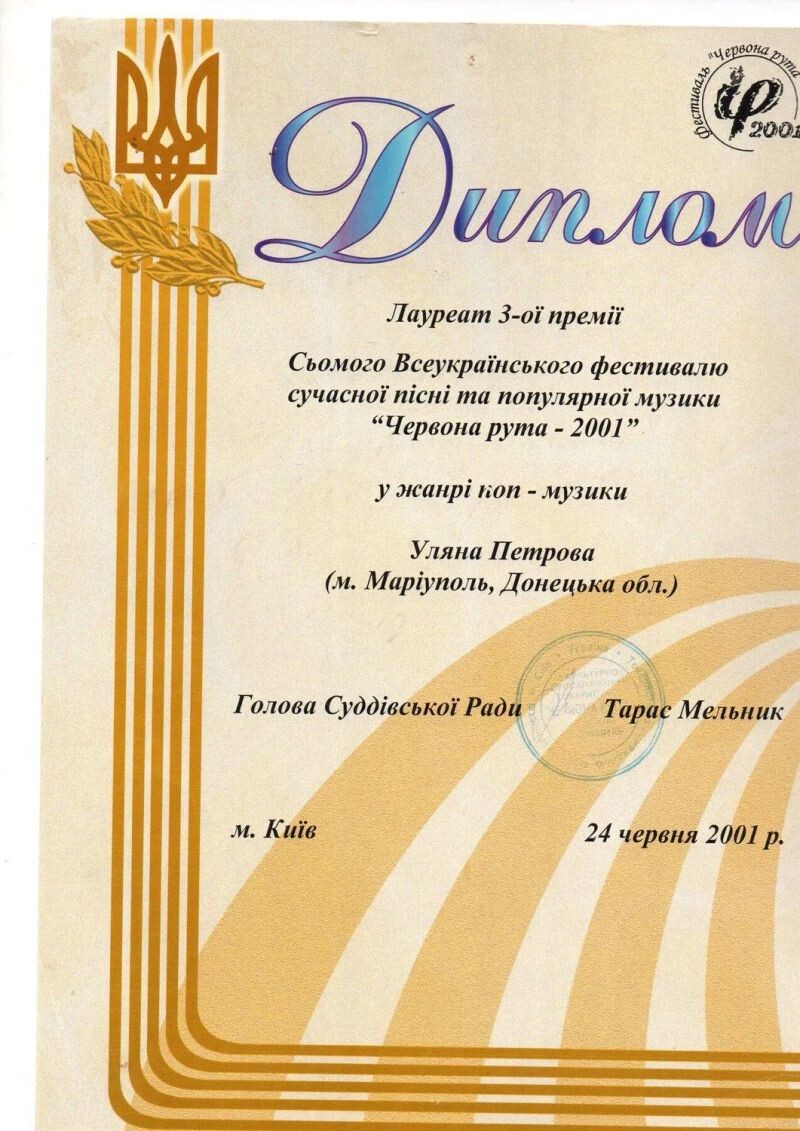 - Лауреат III премии Седьмого Всеукраинского фестиваля современной песни и популярной музыки в жанре «поп-музыка» (г. Киев), 2001 г.