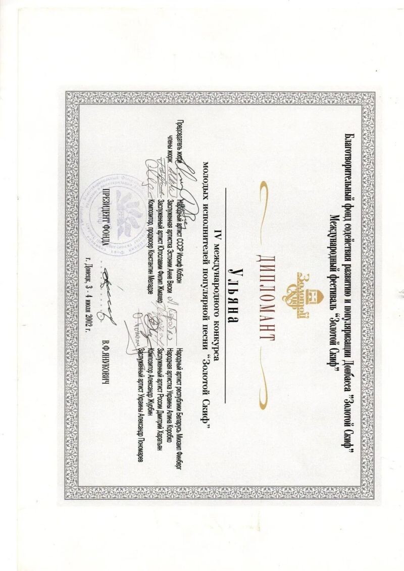 - Дипломант IV международного конкурса молодых исполнителей популярной песни «Золотой Скиф» (г. Донецк), 2002 г.