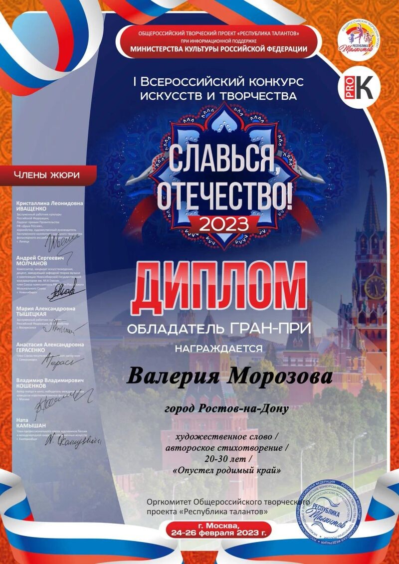 - 1 Всероссийский конкурс искусств и творчества «Славься отечество», гран-при, 2023 г.