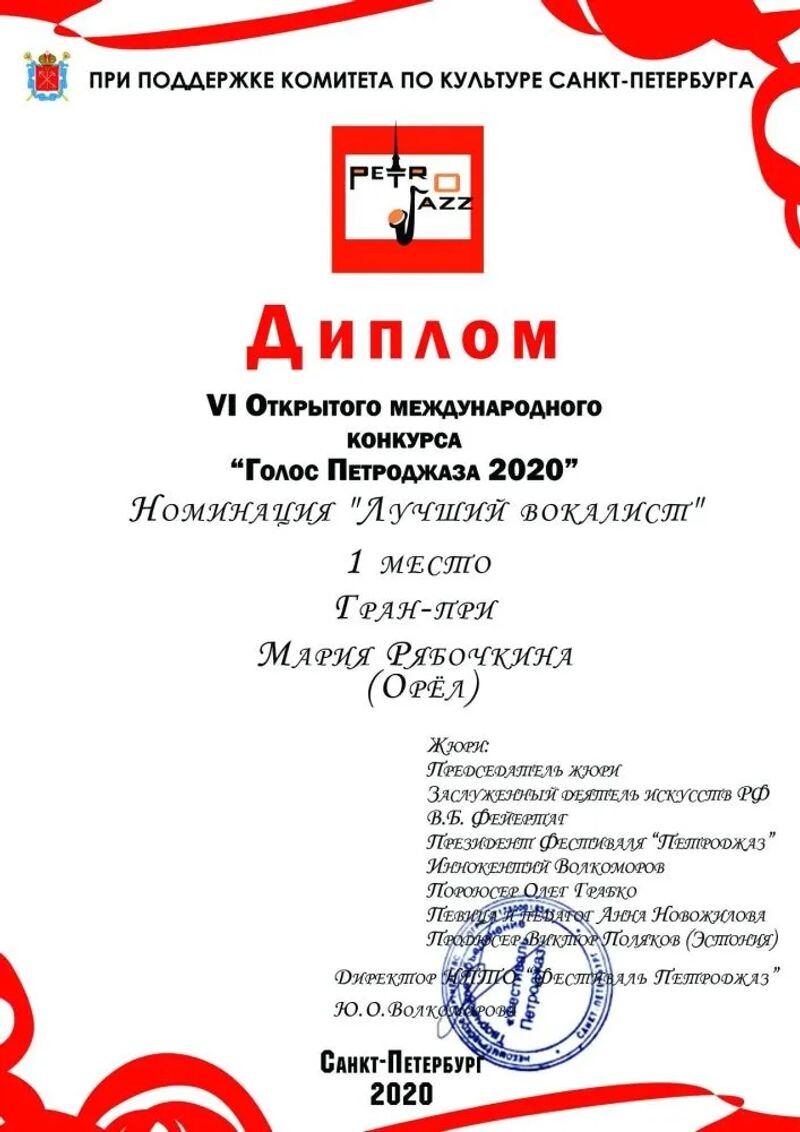 - VI Открытый международный конкурс «Голос Петроджаза 2020», 1 место в номинации «Лучший вокалист», гран-при.