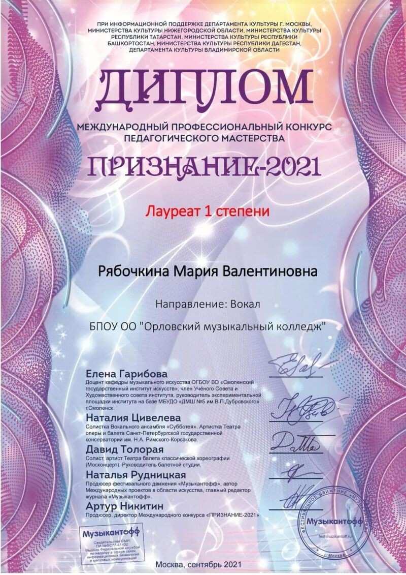 - Лауреат 1 степени международного профессионального конкурса педагогического мастерства «Признание» в направлении «вокал», 2021 г.