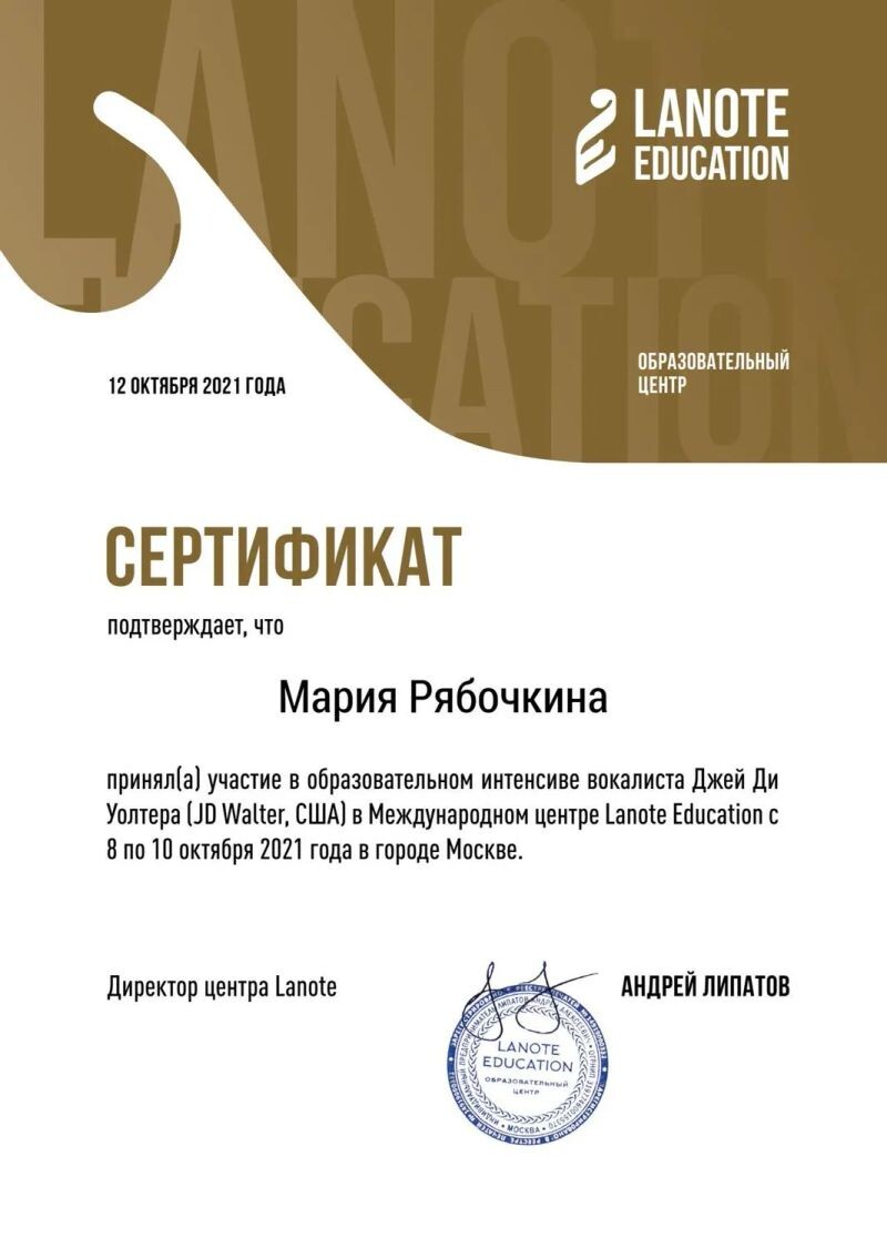- Сертификат участника образовательного интенсива вокалиста Джей Ди Уолтера (JD Walter, США) в Международном центре Lanote Education в городе Москве, 2021 г.