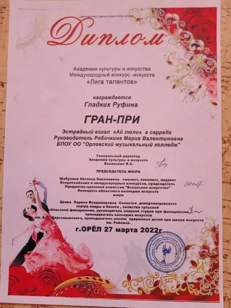 - Диплом моей студентки с Международного конкурса искусств «Лига талантов». Орел, 27.03.2022 г. Участник: Гладких Р. 2 курс – Гран-При в номинации «Эстрадный вокал (A capella)».