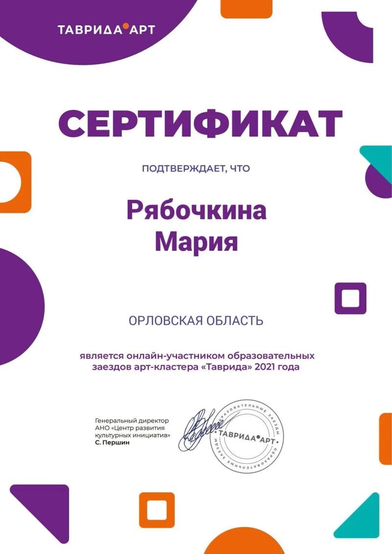- Сертификат онлайн-участника образовательных заездов арт-кластера «Таврида», 2021 г.