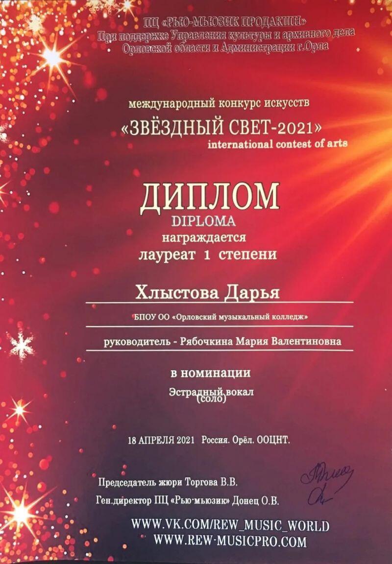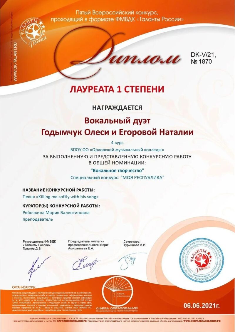 - Диплом моих студентов с 5 Всероссийского конкурса, проходящего в формате ФМВДК «Таланты России». Участник: вокальный дуэт Годымчук О. и Егорова Н. 4 курс – лауреат 1 степени, 2021 г.