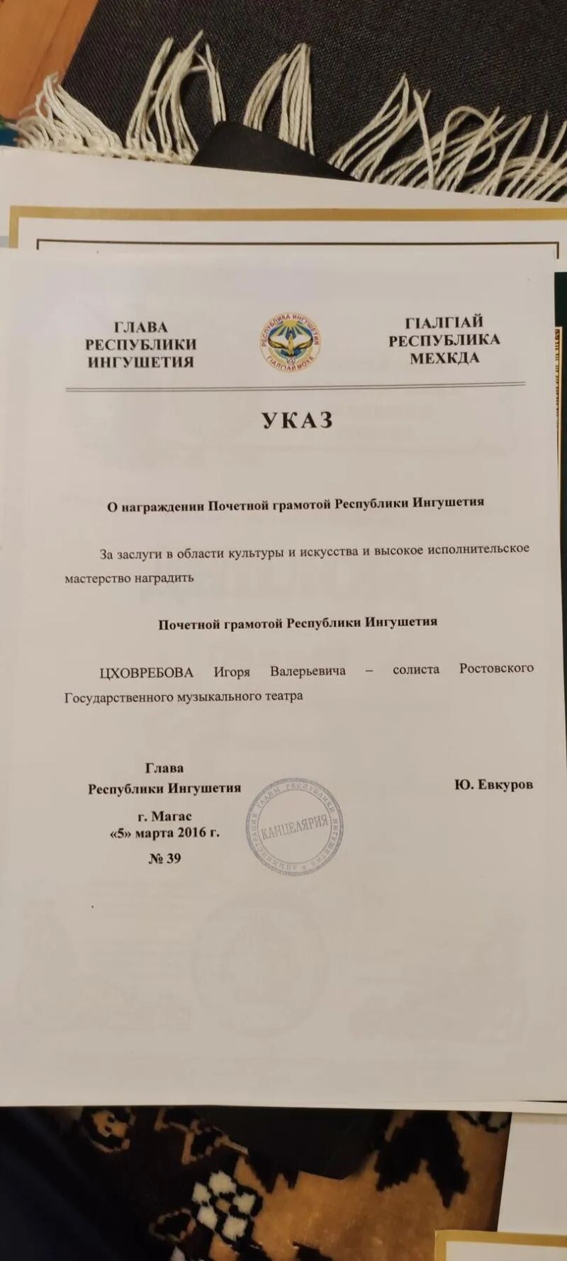 - Глава Республики Ингушетия, указ о награждении Почётной грамотой Республики Ингушетия за заслуги в области культуры и искусства и высокое исполнительское мастерство, 2016 г.