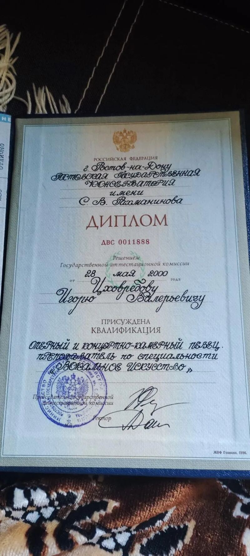 - Ростовская государственная консерватория имени С.В. Рахманинова, оперный и концертно-камерный певец, преподаватель по специальности «вокальное искусство», 1995–2000 гг.