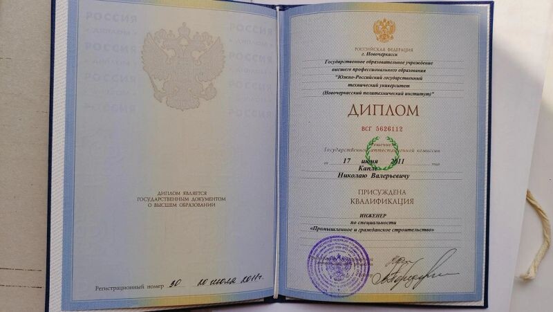 - Инженер по специальности Промышленное и гражданское строительство, 2006–2011 гг.