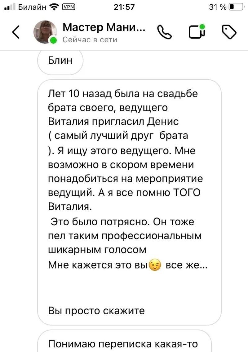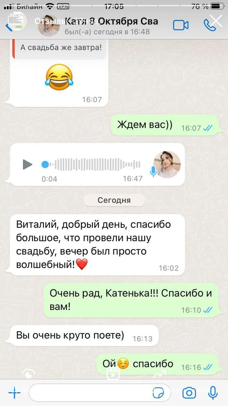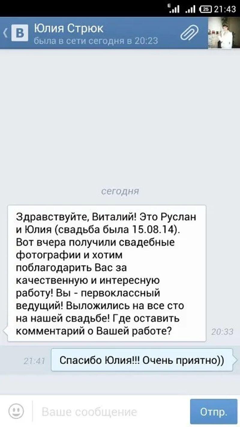 Виталий! Профессионал своего дела! Провел свадебный вечер наших детей "на ура" . Грамотно выстраивает весь процесс, шикарно поёт сам, зажигает публику. Спасибо Вам, Виталий за вашу работу, наши гости все остались довольными!!! Очень советую, если Вы хотите чтобы день оставил светлые, незабываемые впечатления!