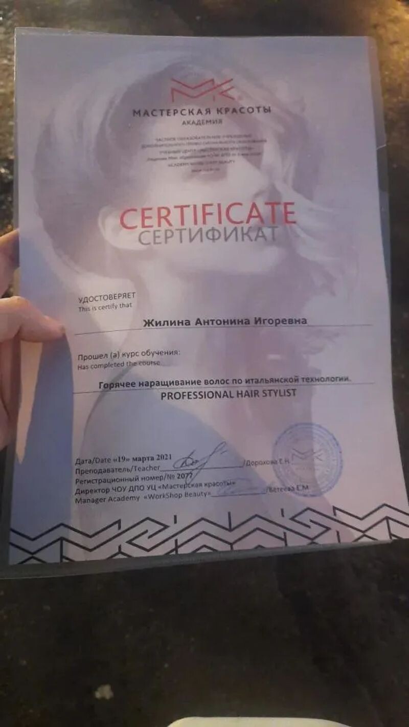 - Академия «Мастерская красоты», курс «Горячее наращивание волос по итальянской технологии», 2021 г.