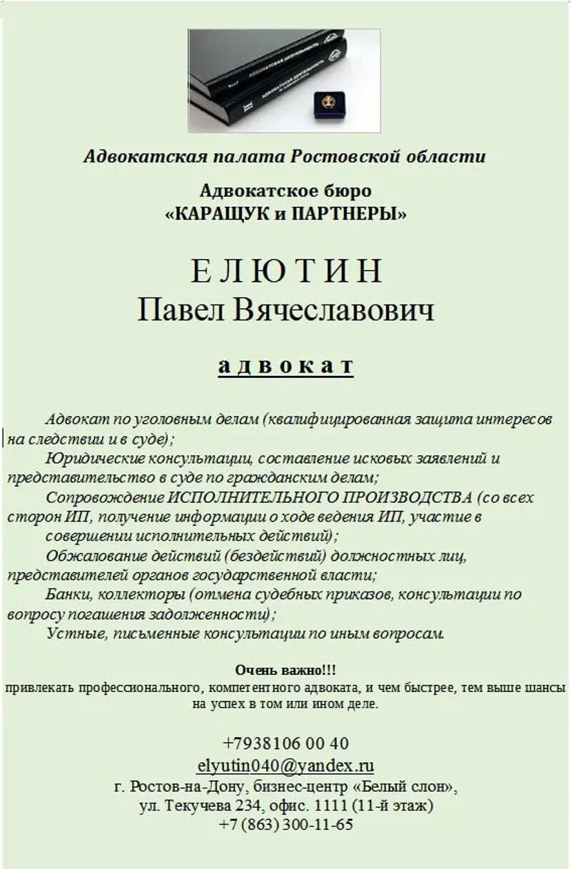 ► Адвокатское бюро "Каращук и партнёры", адвокат принимает территориально: Октябрьский, работает с выездом к клиентам: Батайск.