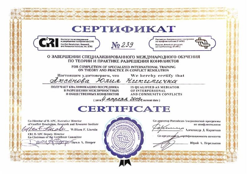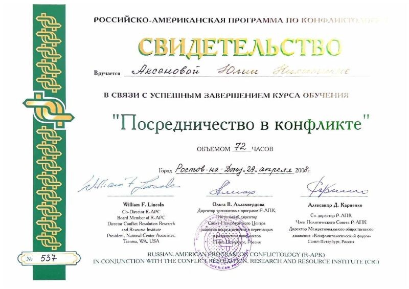 - Российско-американская программа по конфликтологии, курс «Посредничество в конфликте», 72 часа, 2008 г.