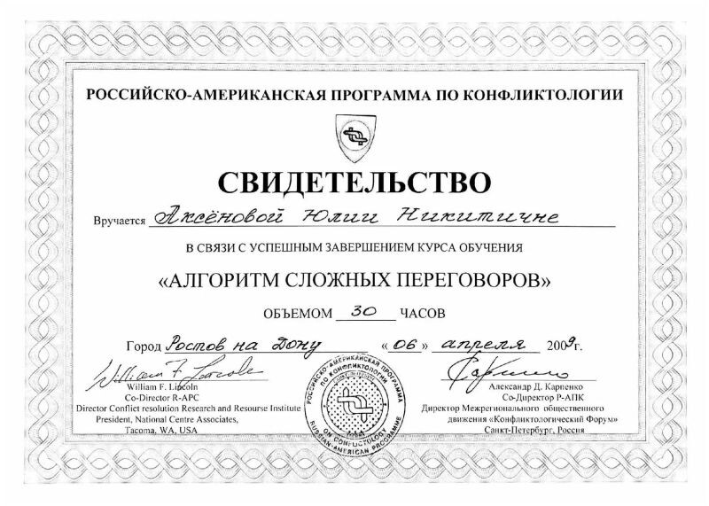 - Российско-американская программа по конфликтологии, курс «Алгоритм сложных переговоров», 30 часов, 2009 г.