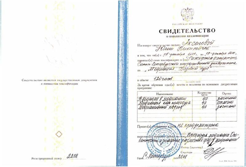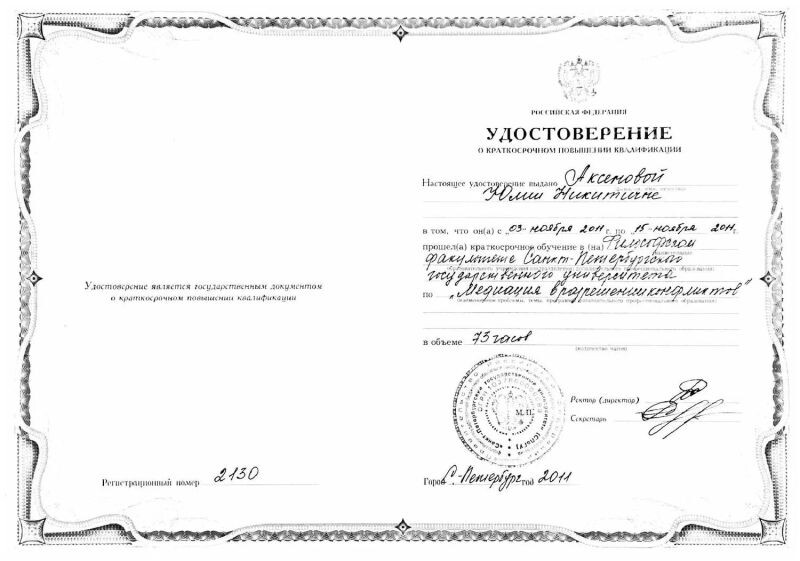 - Санкт-Петербургский государственный университет, философский факультет, «Медиация в разрешении конфликтов», 75 часов, 2011 г.
