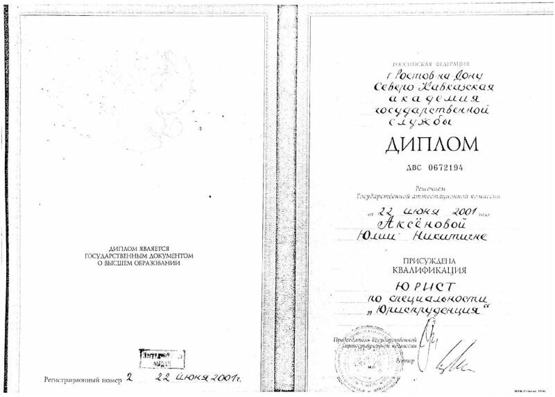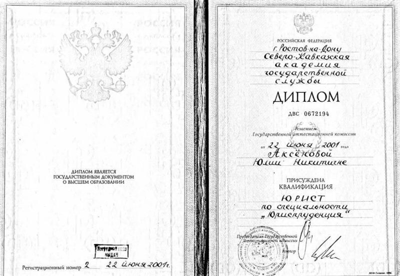 - Северо-Кавказская академия государственной службы, юриспруденция, 2001 г.