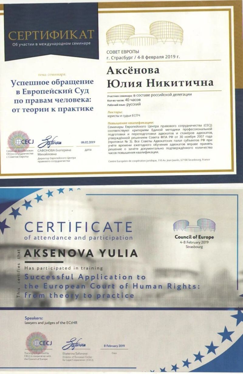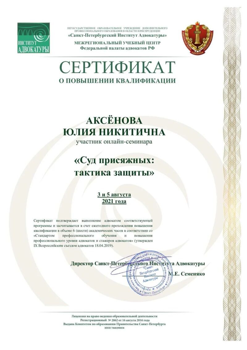 - Санкт-Петербургский институт адвокатуры, сертификат о повышении квалификации, семинар «Суд присяжных: тактика защиты», 2021 г.
