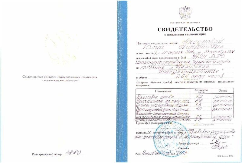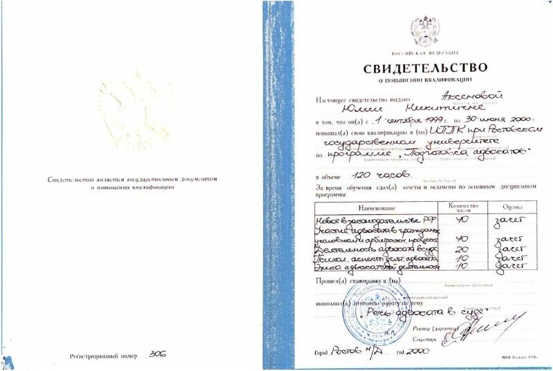 - ИППК при Ростовском государственном университете, программа «Подготовка адвокатов», 120 часов, 1999–2000 гг.