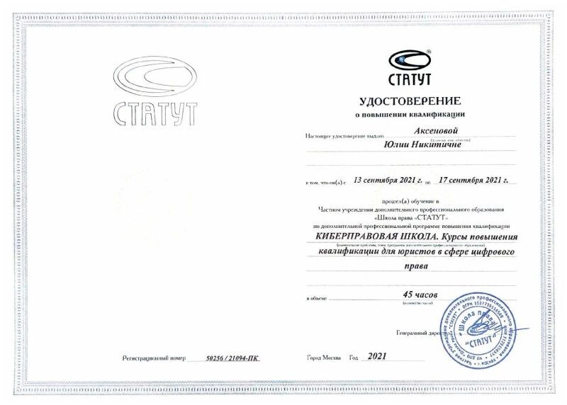 - Школа права «Статут», киберправовая школа, курсы повышения квалификации для юристов в сфере цифрового права, 45 часов, 2021 г.