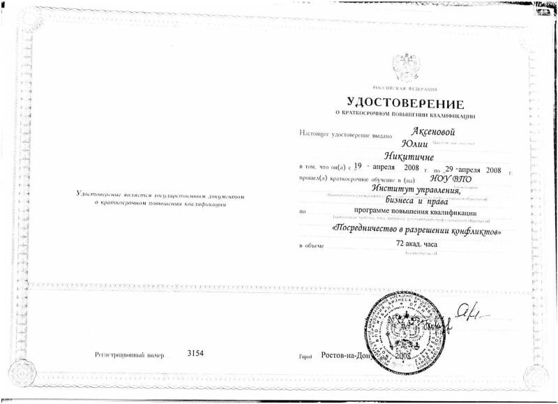 - НОУ ВПО Институт управления, бизнеса и права, программа «Посредничество в разрешении конфликтов», 72 часа, 2008 г.