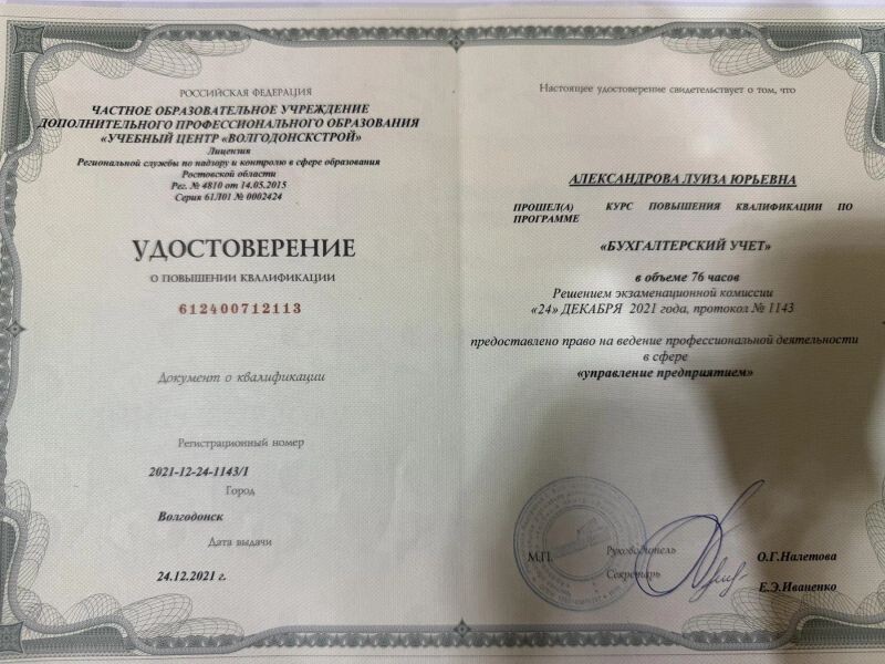 - Учебный центр «Волгодонскстрой», курс повышения квалификации «Бухгалтерский учёт», 2021 г.