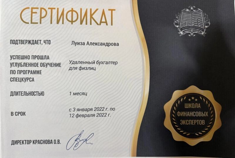 - Школа финансовых экспертов, программа «Удалённый бухгалтер для физических лиц», 2022 г.