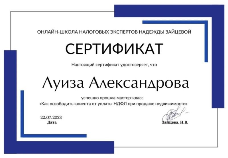 - Онлайн-школа налоговых экспертов Надежды Зайцевой, мастер-класс «Как освободить клиента от уплаты НДФЛ при продаже недвижимости», 2023 г.