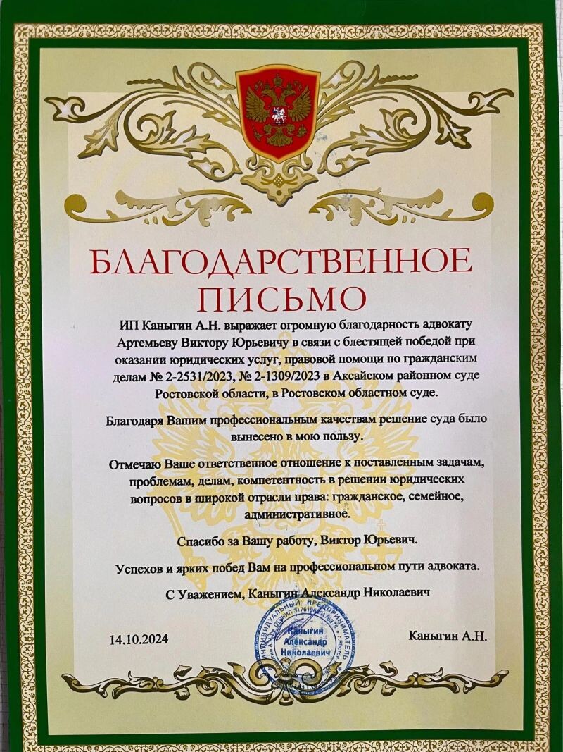 - БЛАГОДАРСТВЕННОЕ ПИСЬМО АДВОКАТУ АРТЕМЬЕВУ ВИКТОРУ ЮРЬЕВИЧУ ОТ ИП КАНЫГИНА АЛЕКСАНДРА НИКОЛАЕВИЧА (с 2024 г.).