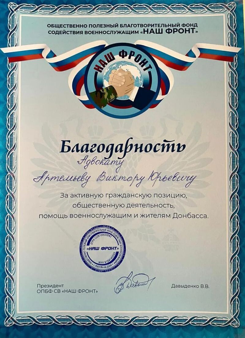 - БЛАГОДАРСТВЕННОЕ ПИСЬМО АДВОКАТУ АРТЕМЬЕВУ ВИКТОРУ ЮРЬЕВИЧУ (с 2025 г.).