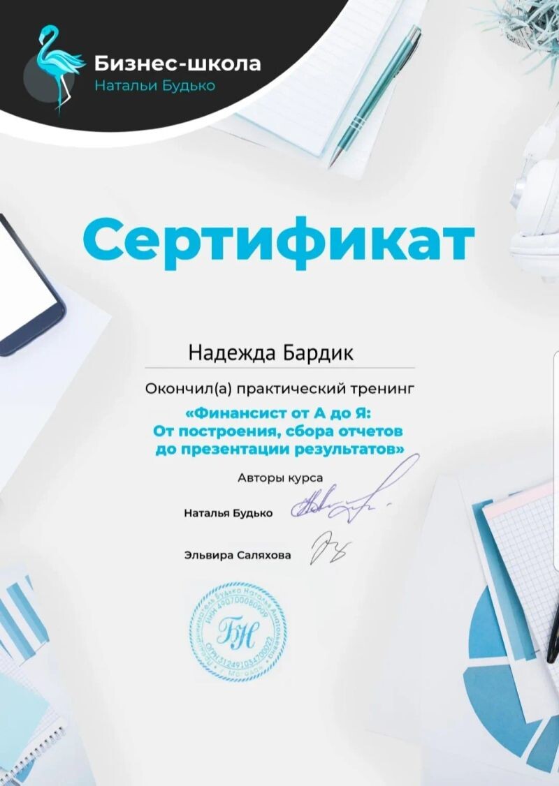 - Бизнес-школа Натальи Будько, тренинг «Финансист от А до Я: от построения, сбора отчётов до презентации результатов», 2023 г.