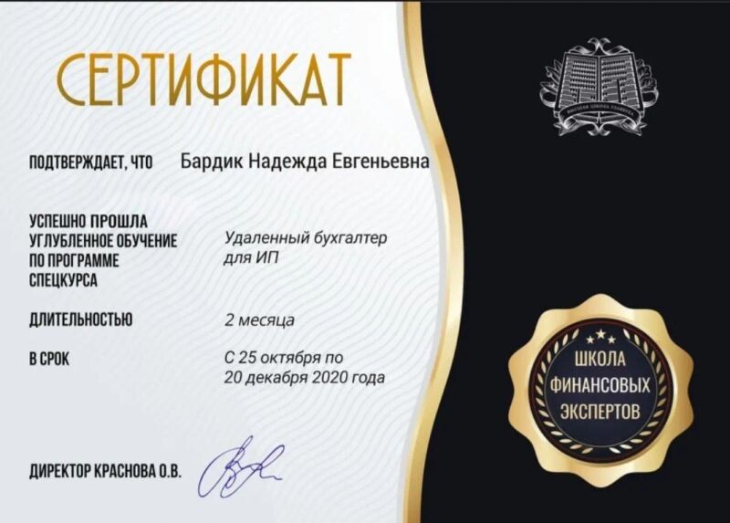- Школа финансовых экспертов, программа «Удаленный бухгалтер для ИП», 2020 г.