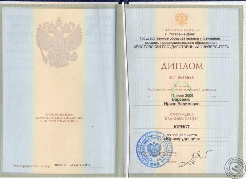 - Ростовский государственный университет (ЮФУ), квалификация «юрист», 2001–2006 гг.