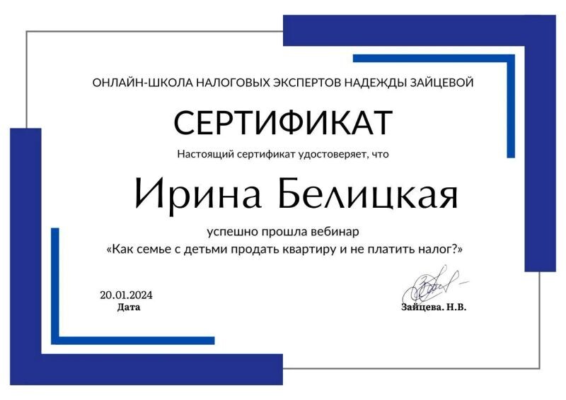 - Онлайн-школа налоговых экспертов Надежды Зайцевой, мастер-класс «Как семье с детьми продать квартиру и не платить налог?», 2024 г.