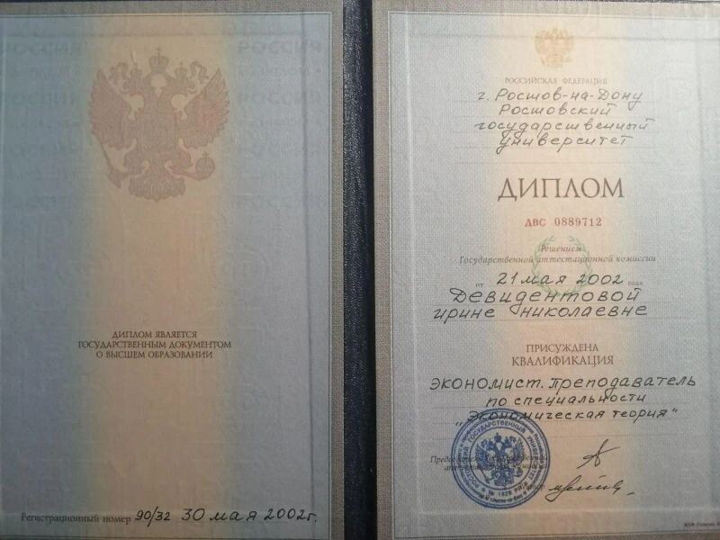 - Ростовский государственный университет, экономист, преподаватель, 1996–2002 гг.