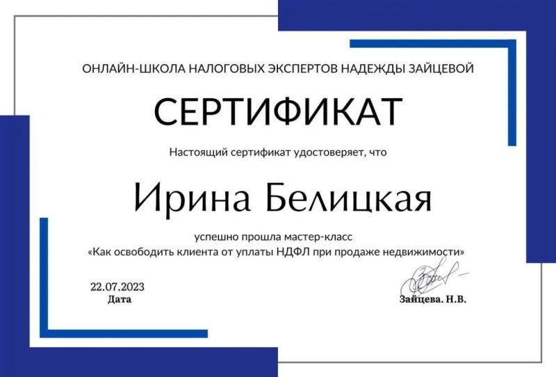 - Онлайн-школа налоговых экспертов Надежды Зайцевой, мастер-класс «Как освободить клиента от уплаты НДФЛ при продаже недвижимости», 2023 г.