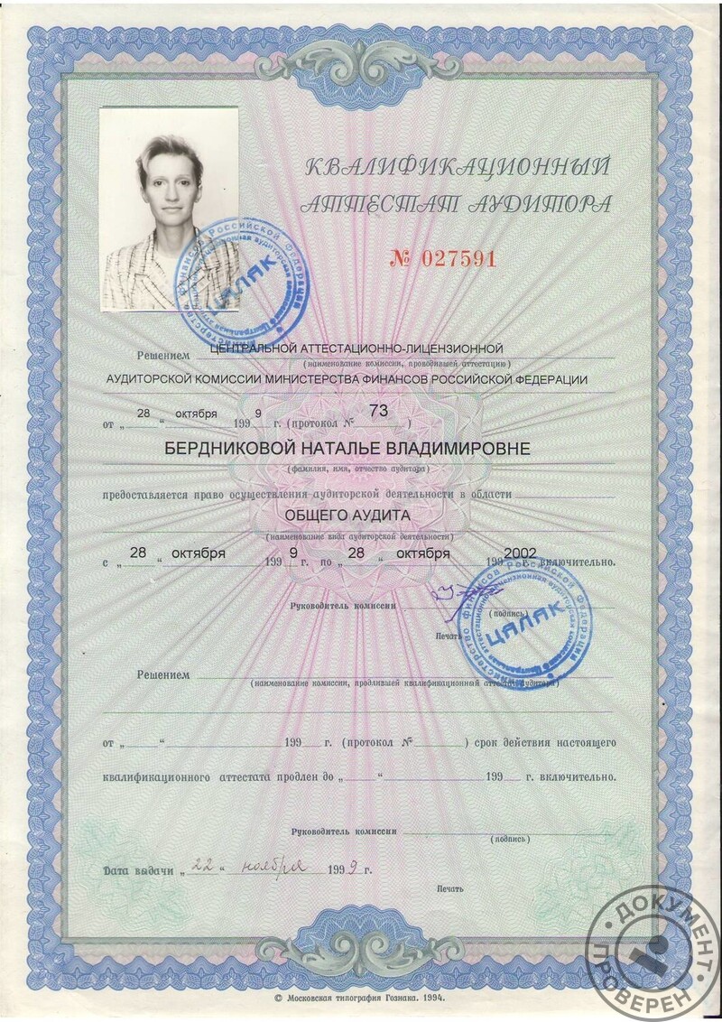 - Компания «Цалак», аттестат аудитора, 1999–2002 гг.