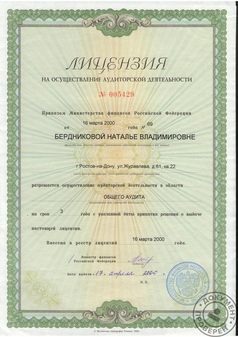 - Лицензия на осуществление аудиторской деятельности, 2000 г.
