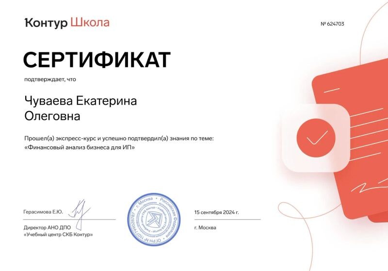 - Прошел(а) экспресс-курс и успешно подтвердил(а) знания по теме: «Финансовый анализ бизнеса для ИП» (с 2024 г.).