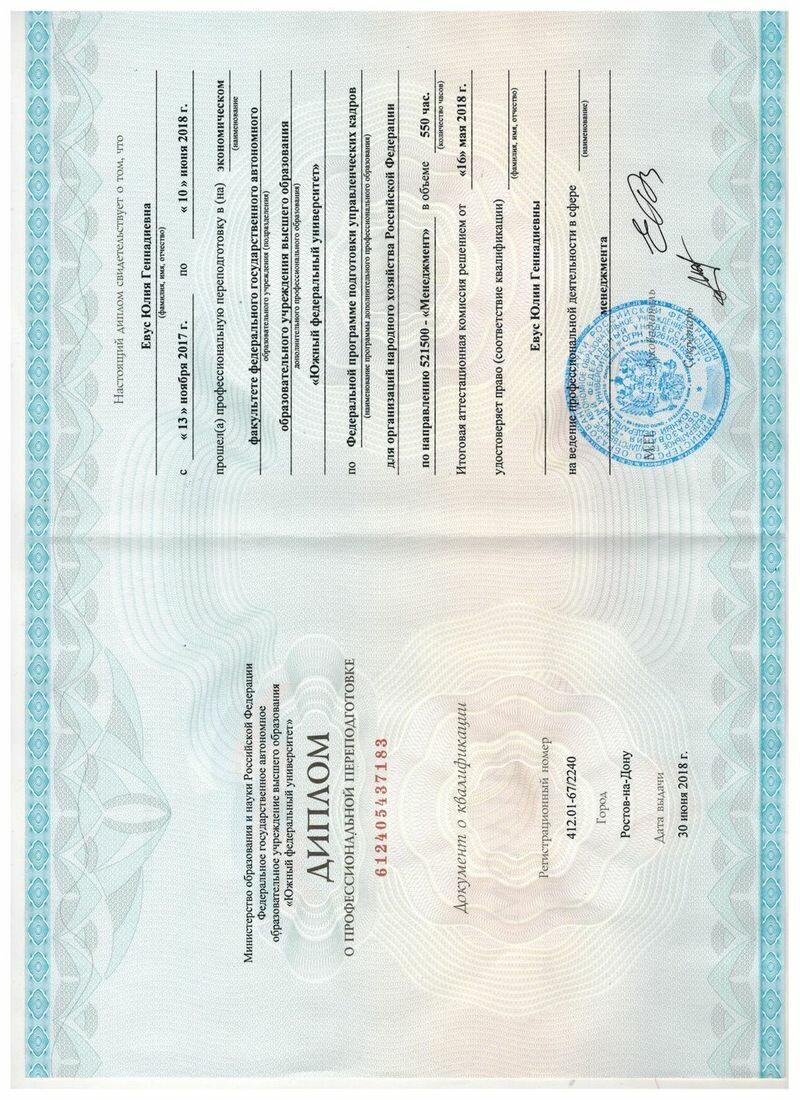 - Южный федеральный университет, специальность «менеджмент», 2017–2018 гг.