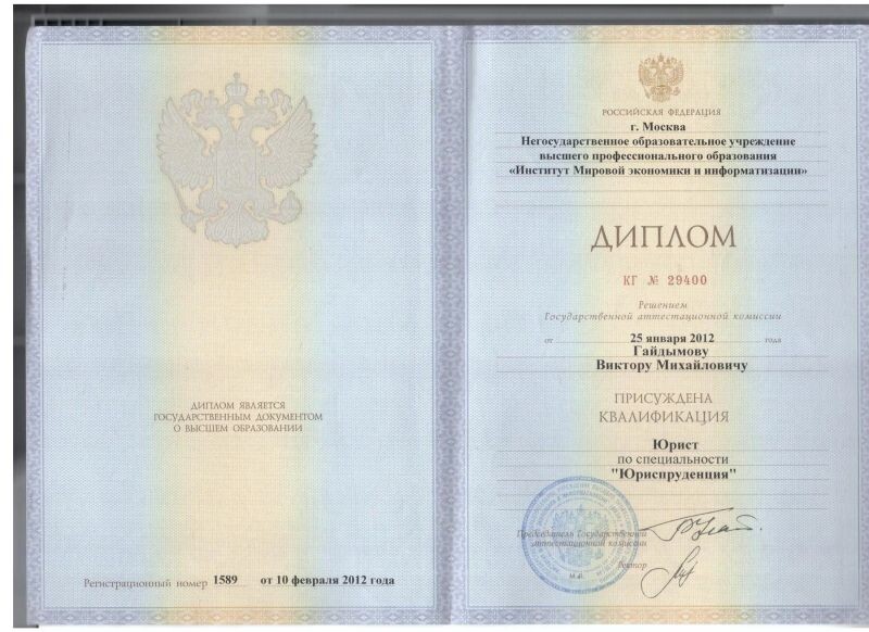 - Институт мировой экономики и информатизации, факультет юриспруденции, специальность – юрист, 2012 г.