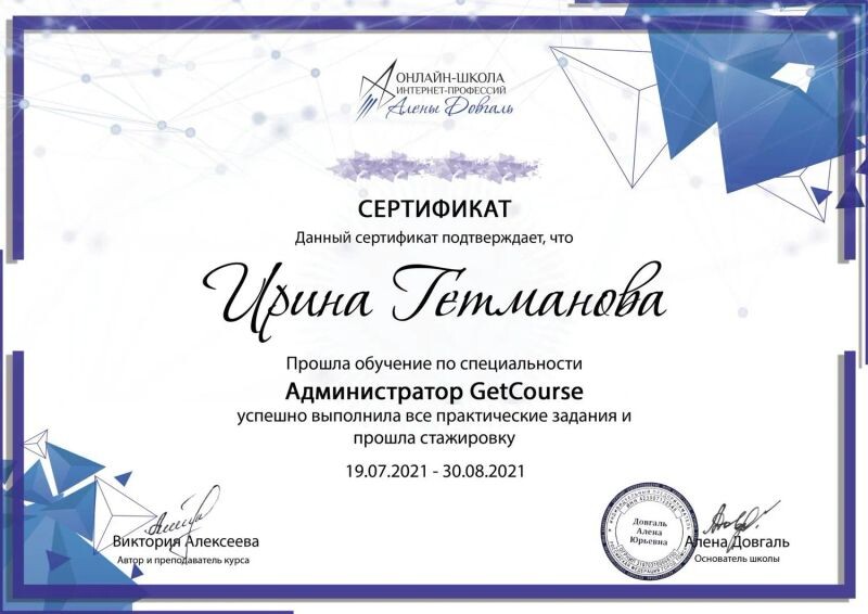 - Курс Виктории Алексеевой «Администратор GetCourse», 2021 г.